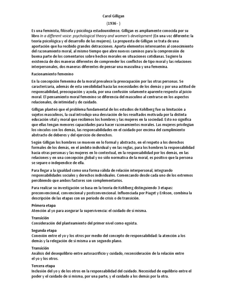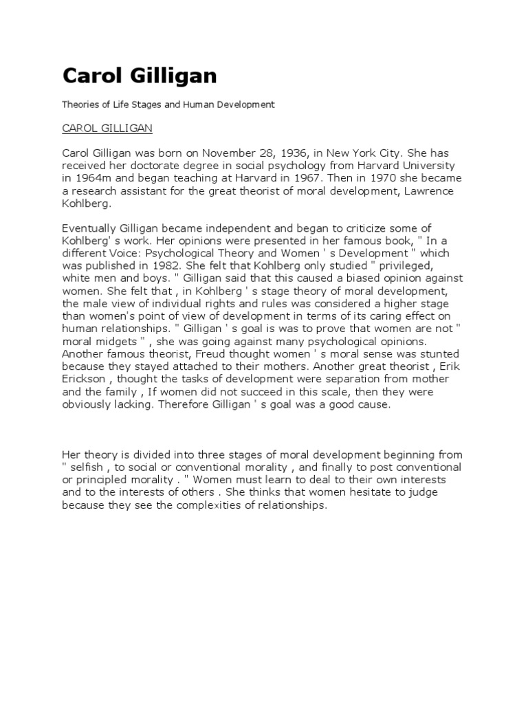 M424 Carol Gilligan\u2019s theory of moral development ... from www.coursehero.com Lawrence kohlberg and carol gilligan is both psychologists' that are attempting to identify the diversity of morals upon both genders of the human race. In the book in a different voice. Heinz steals the drug in europe.8. Kohlberg started his research on moral development in the we show that the moral principles applied by individuals to the problem of capital punishment carol gilligan, a friend and a colleague of kohlberg, familiarized herself very deeply with kohlberg's research method and moral thinking. Hence she proposed a theory which has the same three stages of kohlberg but with different stages. Gilligan also makes this important note that men and women reason differently, and she argues that men and women have different golds. She suggested that kohlberg's theories were biased against women, as only males were used in his studies. Carol gilligan, in her book in a different voice, has argued that kohlberg's theory is excessively androcentric.12 kohlberg's theory was initially based on empirical research.