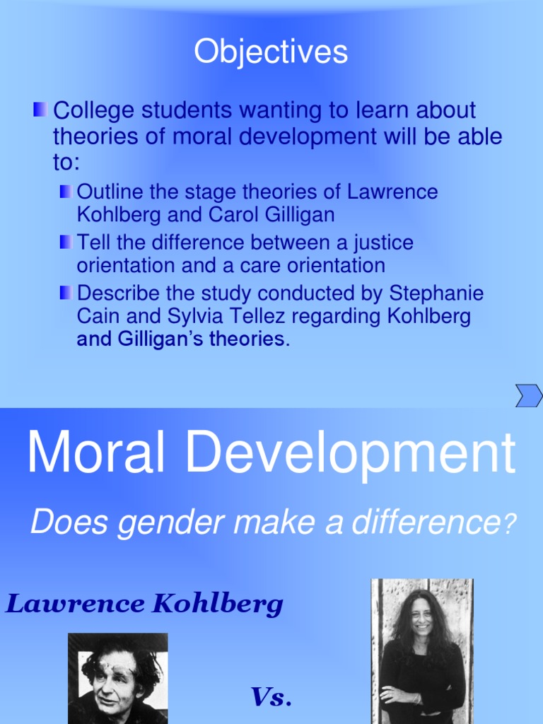 Correct girls and boys typically assess situations as right and wrong using different standards. Kohlberg extended piaget's theory, proposing that moral development is a continual process that occurs throughout the lifespan. Carol gilligan is a psychologist who worked alongside erik erikson and lawrence kohlberg and began focusing on moral development and dilemmas of women. Kohlberg's theory studied only white males. Carol gilligan was the first to consider gender differences in her research with the mental processes of males and.
